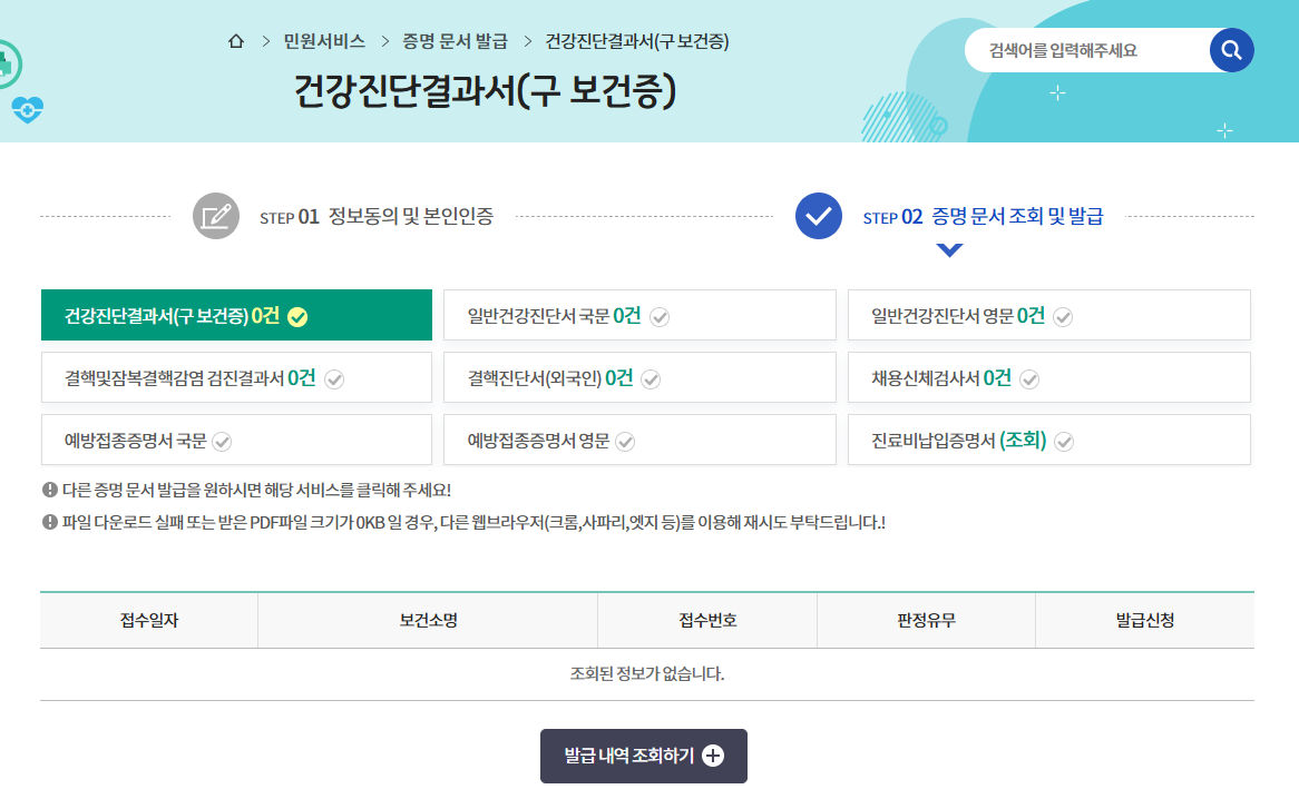 5. 신청 완료가되면 건강진단결과서를 출력하거나 pdf파일을 다운로드 하면 됩니다.